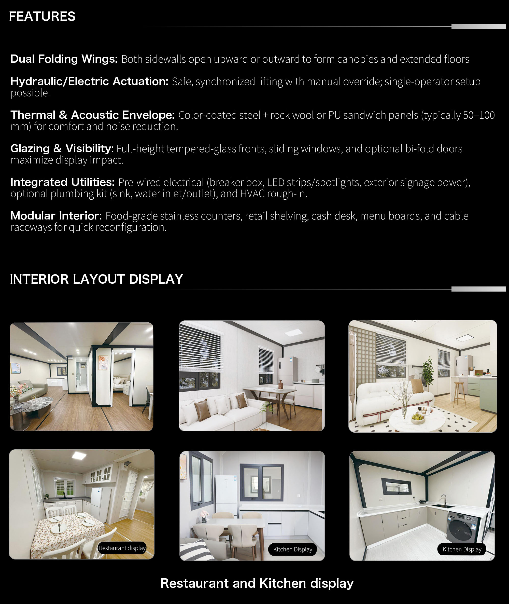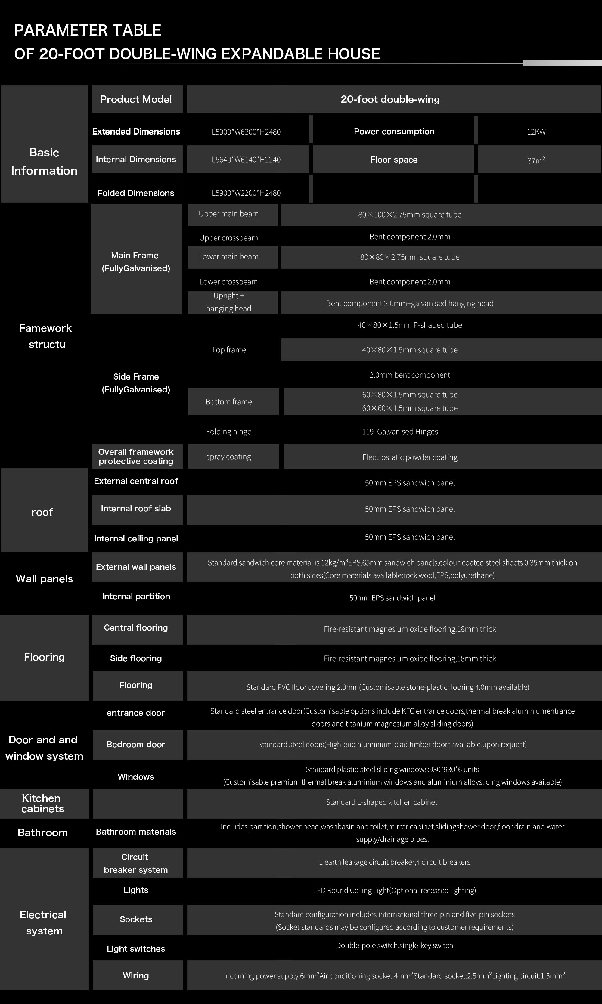 The Double-Wing Expandable Container House is a relocatable, factory-finished building that unfolds from a compact shipping frame into a generous, light-filled interior in a matter of hours. Two side wings hinge out from the core module to create a wide, column-free room that supports living, retail, hospitality, education, healthcare, and office use. Built with a galvanized steel chassis and insulated sandwich panels, it delivers the comfort of a conventional structure while retaining the speed, predictability, and portability of modular construction.