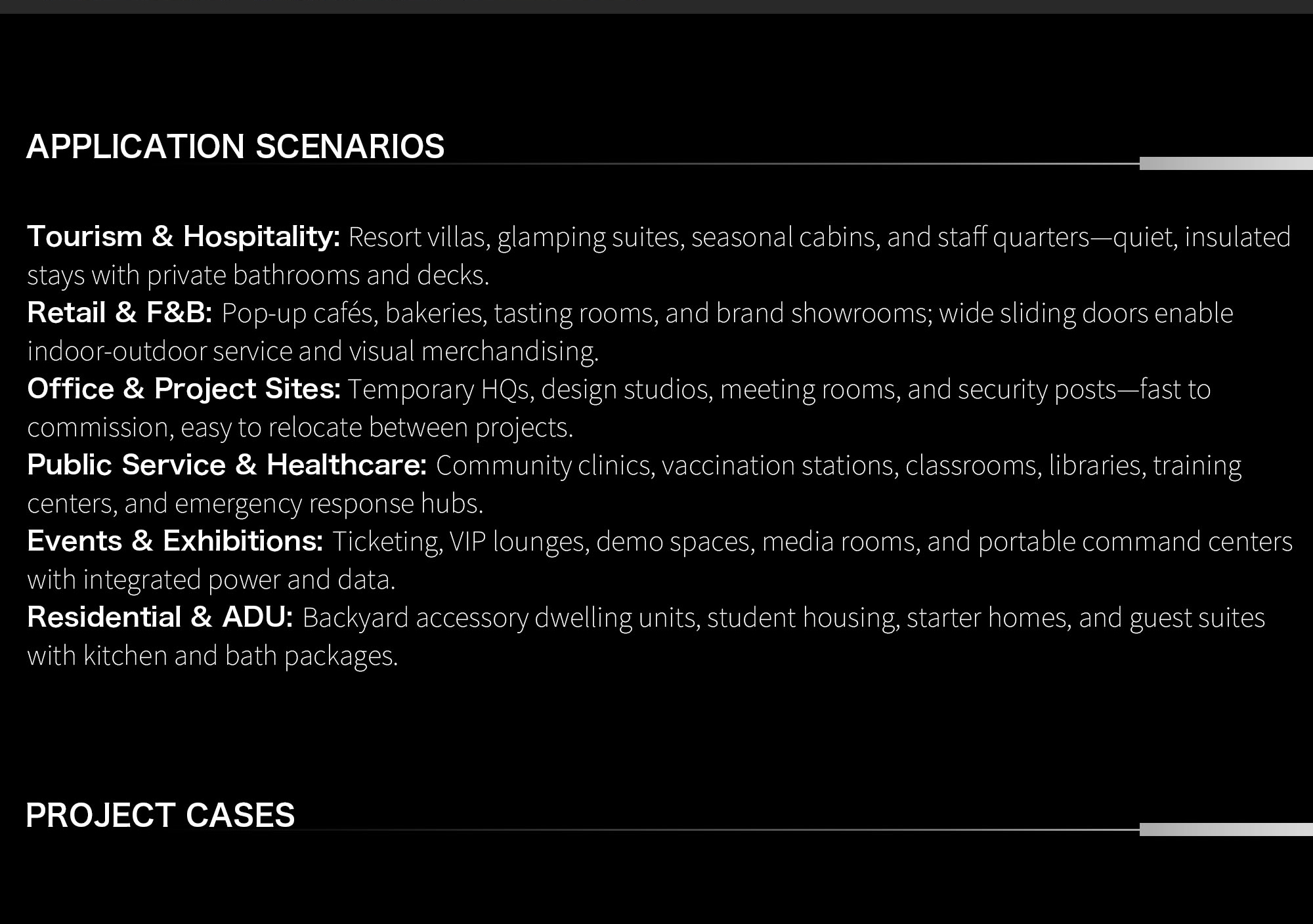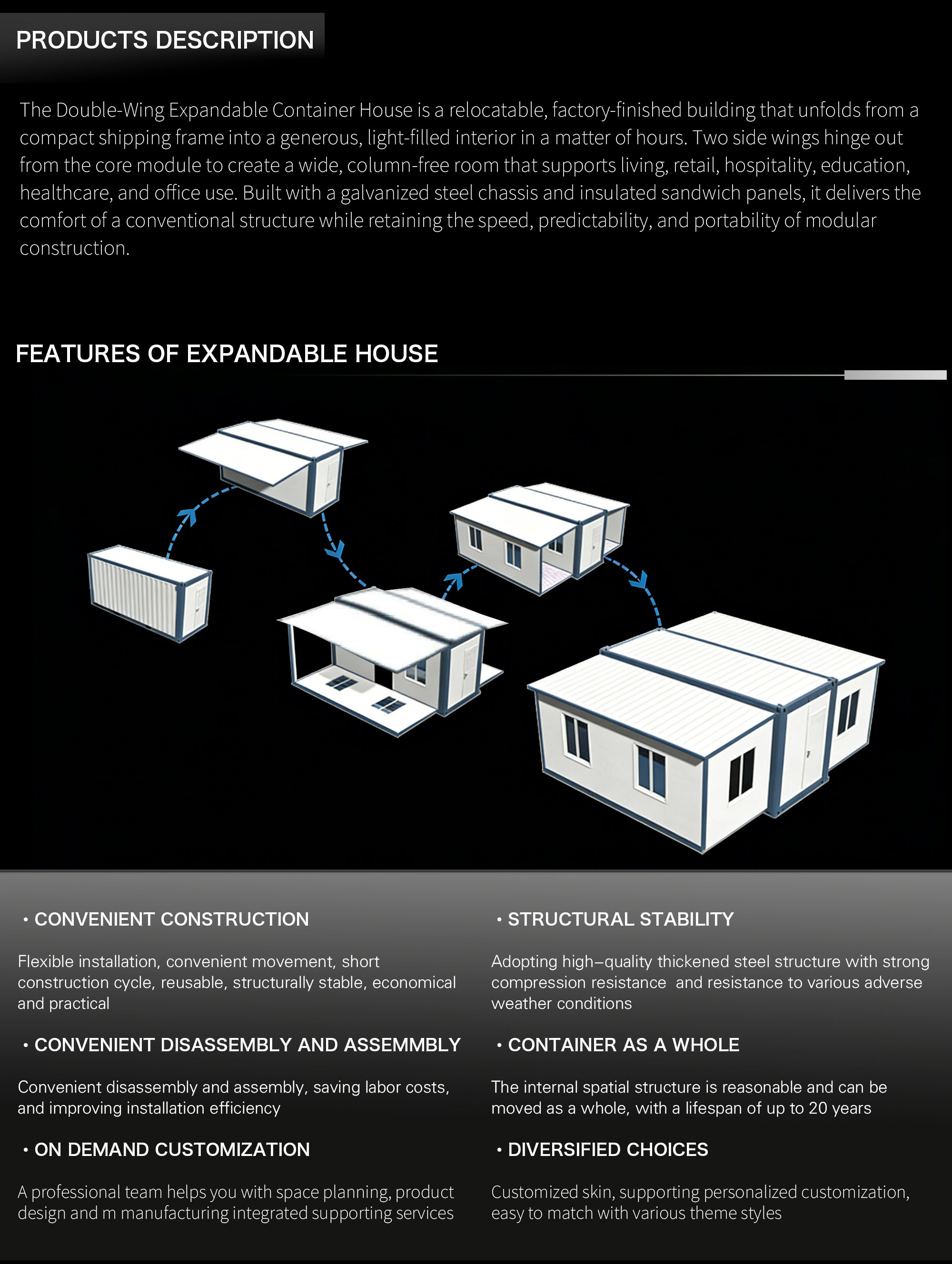 The Double-Wing Expandable Container House is a relocatable, factory-finished building that unfolds from a compact shipping frame into a generous, light-filled interior in a matter of hours. Two side wings hinge out from the core module to create a wide, column-free room that supports living, retail, hospitality, education, healthcare, and office use. Built with a galvanized steel chassis and insulated sandwich panels, it delivers the comfort of a conventional structure while retaining the speed, predictability, and portability of modular construction.