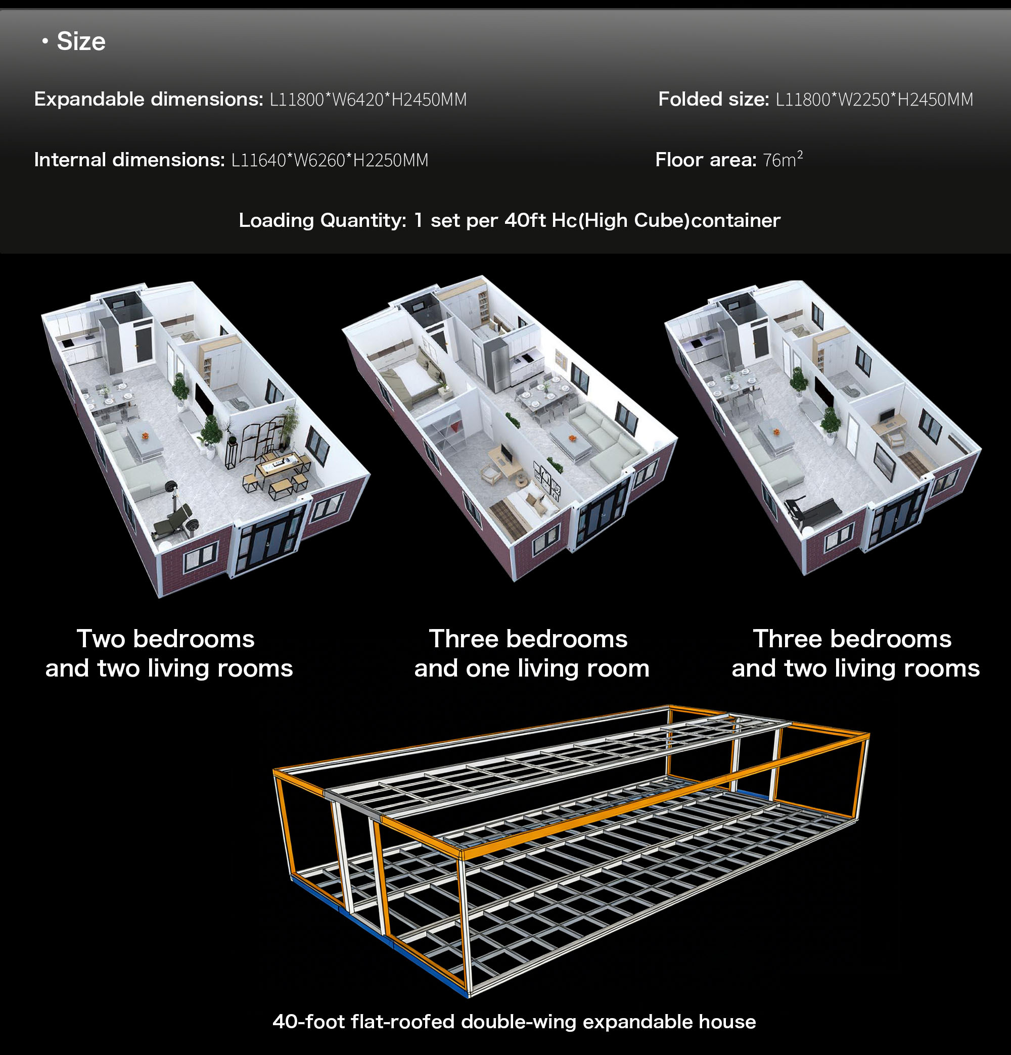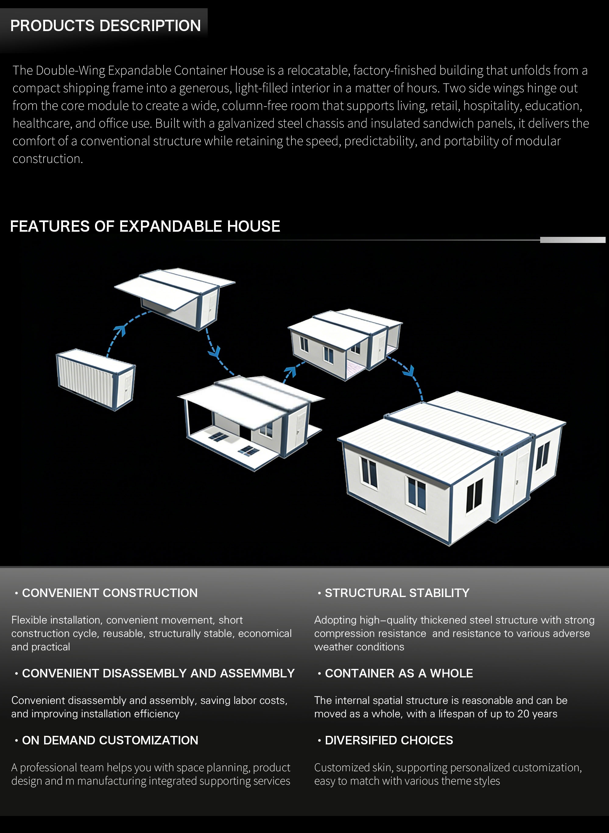 The Double-Wing Expandable Container House is a relocatable, factory-finished building that unfolds from a compact shipping frame into a generous, light-filled interior in a matter of hours. Two side wings hinge out from the core module to create a wide, column-free room that supports living, retail, hospitality, education, healthcare, and office use. Built with a galvanized steel chassis and insulated sandwich panels, it delivers the comfort of a conventional structure while retaining the speed, predictability, and portability of modular construction.