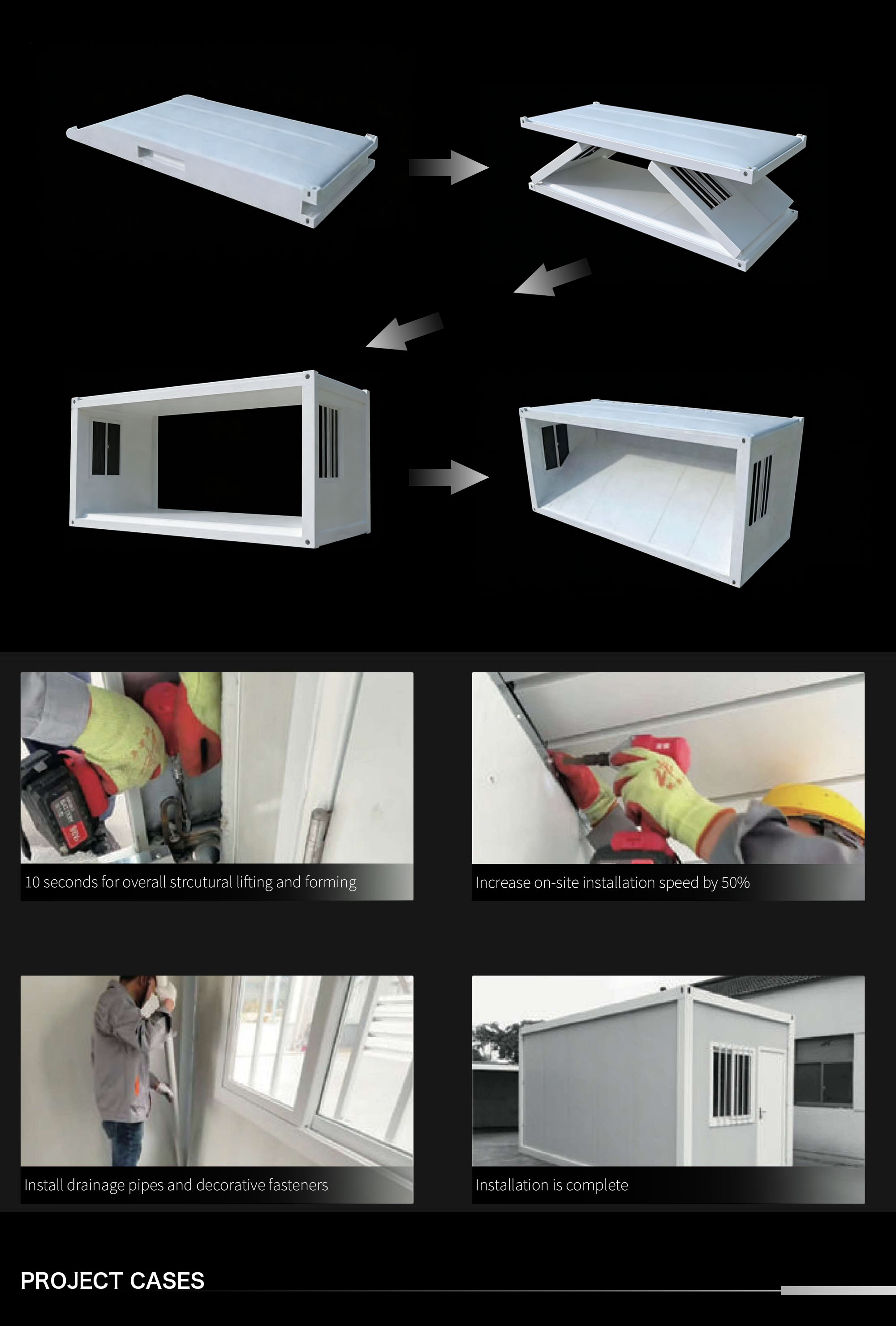 The "Z" type foldable container house is more suitable for emergency construction and worker dormitories. Emergency projects generally require a very short construction cycle, and the "Z" type foldable container house is installed very quickly on site. Three people can build a single box of finished products in just half an hour, and up to 14 sets of boxes can be transported by single vehicle, reducing transportation costs and saving time. And in terms of quality, appearance, and practicality, it can be comparable to packaging boxes.