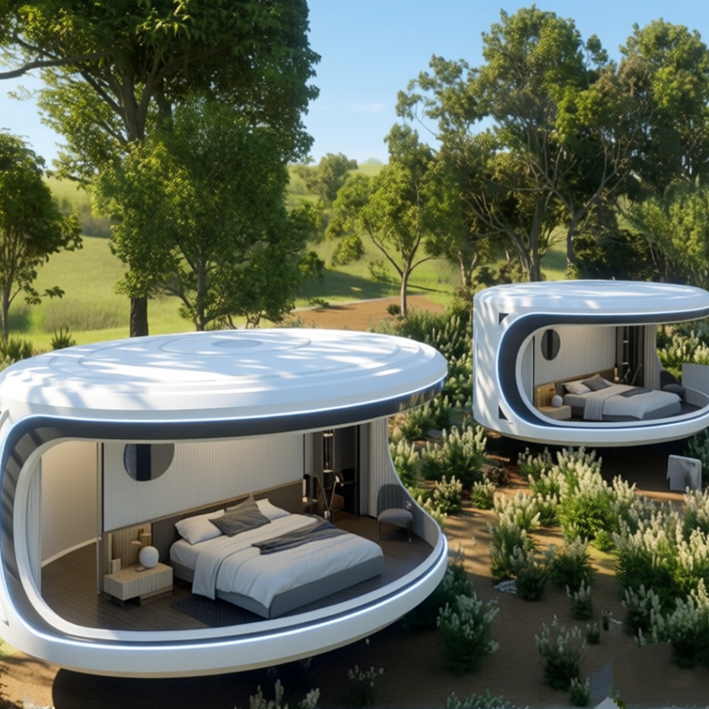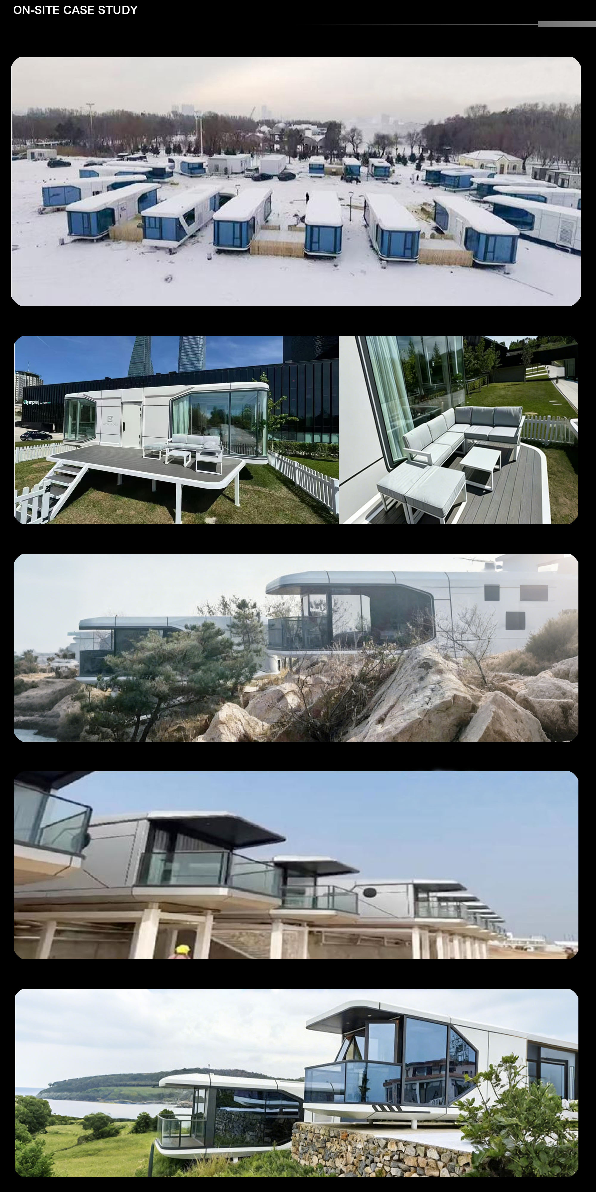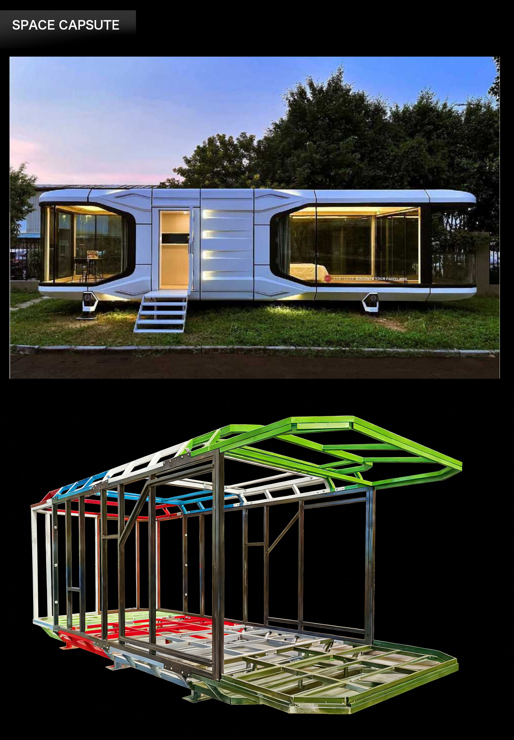 Space capsule houses are designed based on the appearance of the space capsule and can generally be used as resorts, camping sites, homestays, hotels, etc. The space cabin adopts a steel structure frame, with outer walls made of aviation aluminum plates and walls made of high-end insulation materials; The panoramic view surrounds the french window, and the top is the viewing skylight, all of which are made of double-layer hollow tempered glass; The indoor floor adopts advanced composite wood flooring. The entire house adopts an intelligent system, with curtains, skylights, projectors, central air conditioning, lighting, etc. all controlled by the intelligent system, which has a strong sense of technology.
