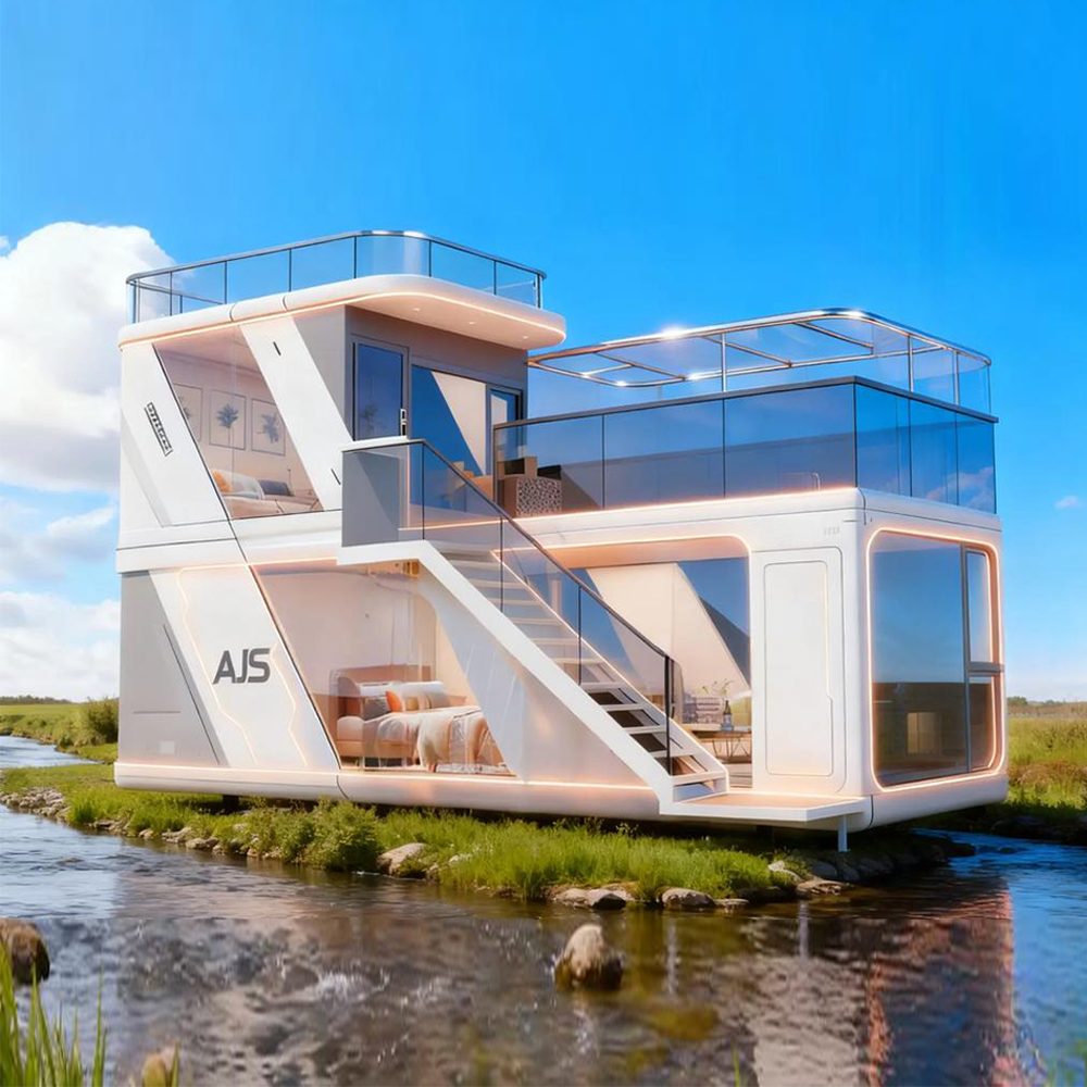 Space capsule houses are designed based on the appearance of the space capsule and can generally be used as resorts, camping sites, homestays, hotels, etc. The space cabin adopts a steel structure frame, with outer walls made of aviation aluminum plates and walls made of high-end insulation materials; The panoramic view surrounds the french window, and the top is the viewing skylight, all of which are made of double-layer hollow tempered glass; The indoor floor adopts advanced composite wood flooring. The entire house adopts an intelligent system, with curtains, skylights, projectors, central air conditioning, lighting, etc. all controlled by the intelligent system, which has a strong sense of technology.