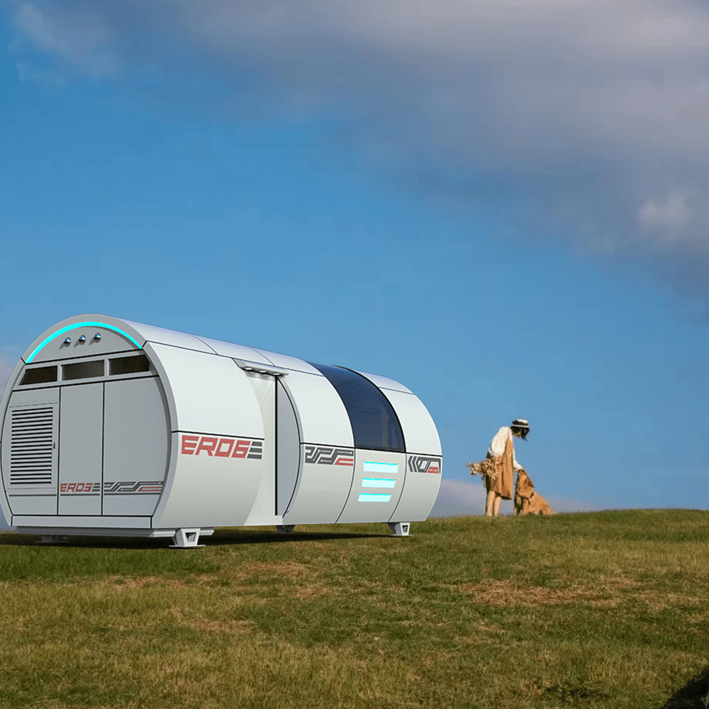 Space capsule houses are designed based on the appearance of the space capsule and can generally be used as resorts, camping sites, homestays, hotels, etc. The space cabin adopts a steel structure frame, with outer walls made of aviation aluminum plates and walls made of high-end insulation materials; The panoramic view surrounds the french window, and the top is the viewing skylight, all of which are made of double-layer hollow tempered glass; The indoor floor adopts advanced composite wood flooring. The entire house adopts an intelligent system, with curtains, skylights, projectors, central air conditioning, lighting, etc. all controlled by the intelligent system, which has a strong sense of technology.