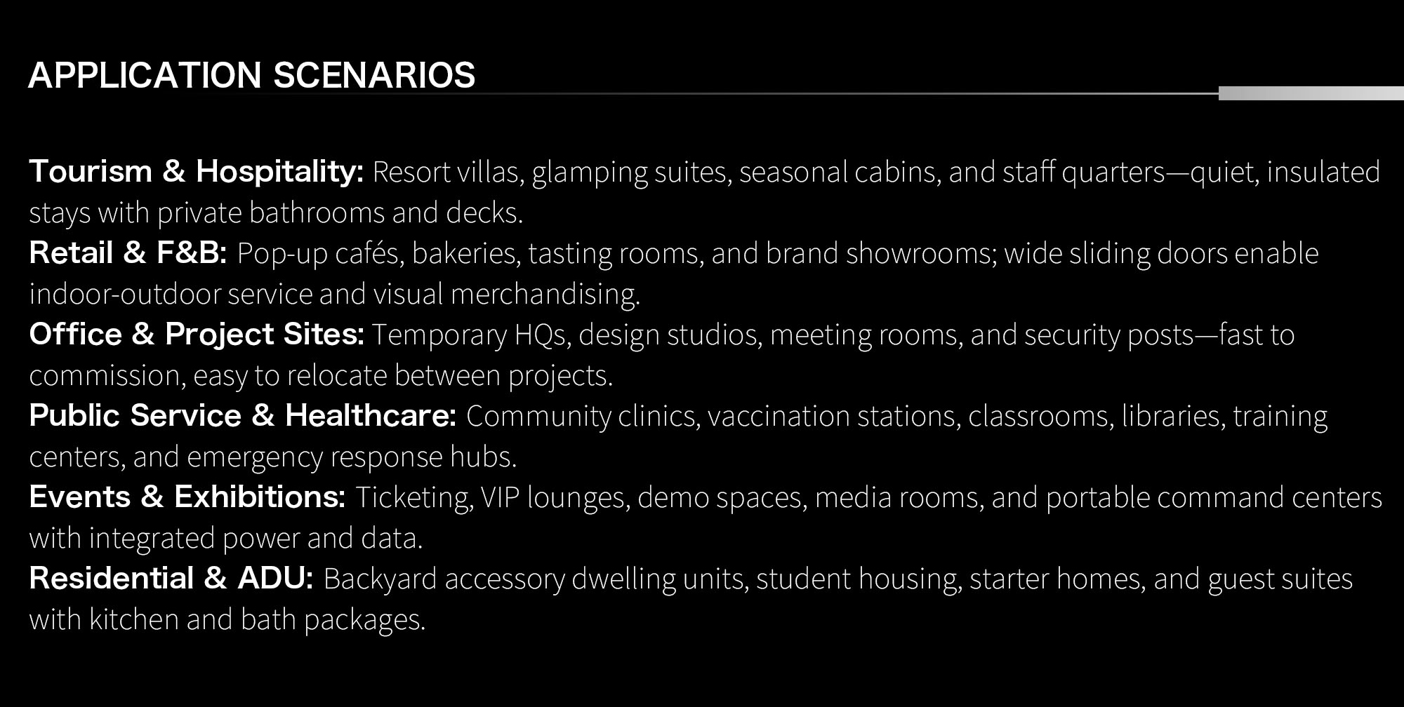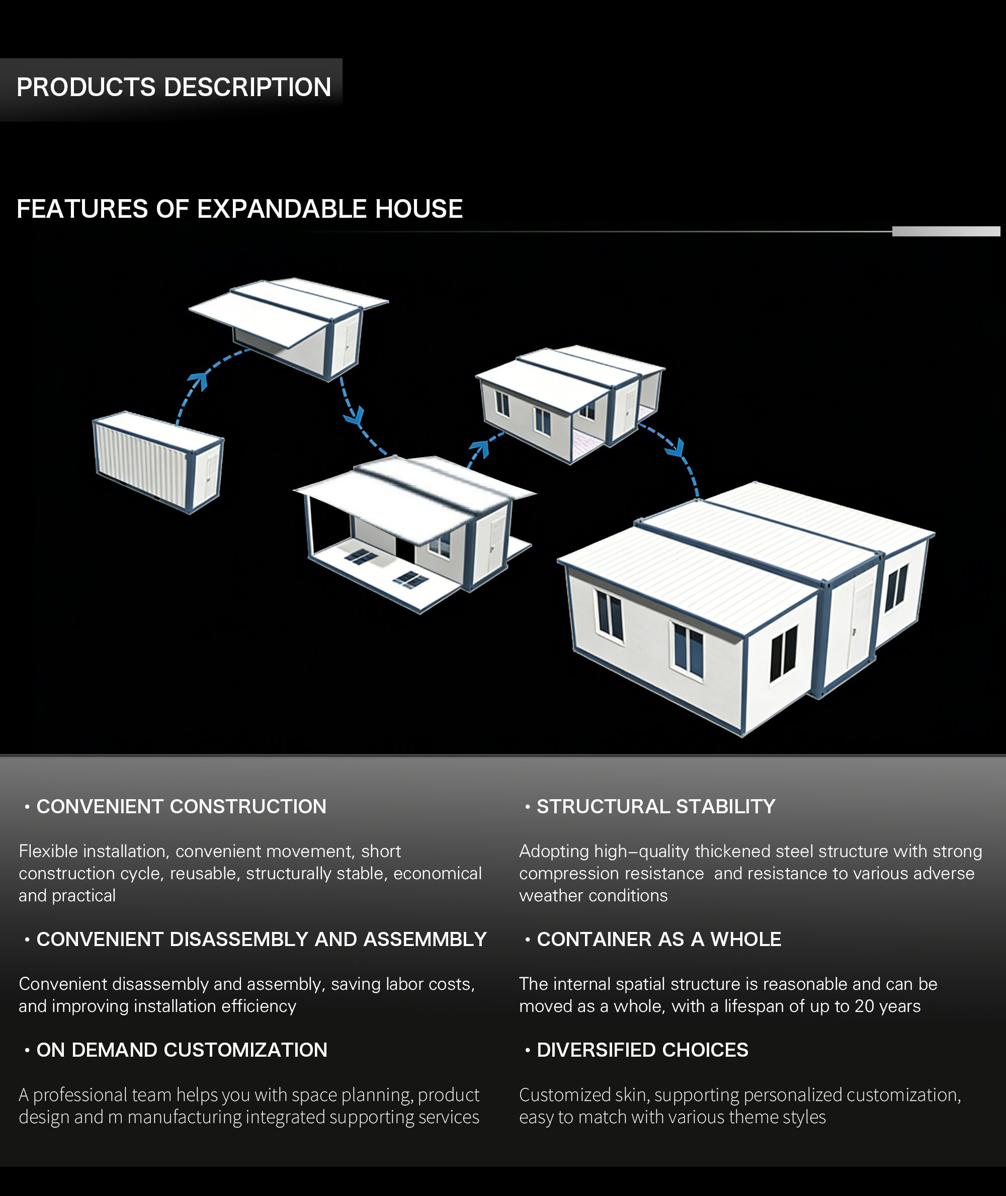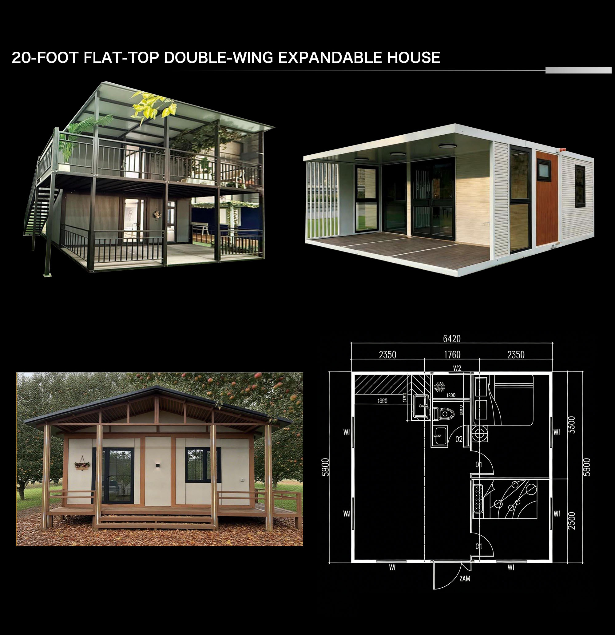 The Double-Wing Expandable Container House is a relocatable, factory-finished building that unfolds from a compact shipping frame into a generous, light-filled interior in a matter of hours. Two side wings hinge out from the core module to create a wide, column-free room that supports living, retail, hospitality, education, healthcare, and office use. Built with a galvanized steel chassis and insulated sandwich panels, it delivers the comfort of a conventional structure while retaining the speed, predictability, and portability of modular construction.