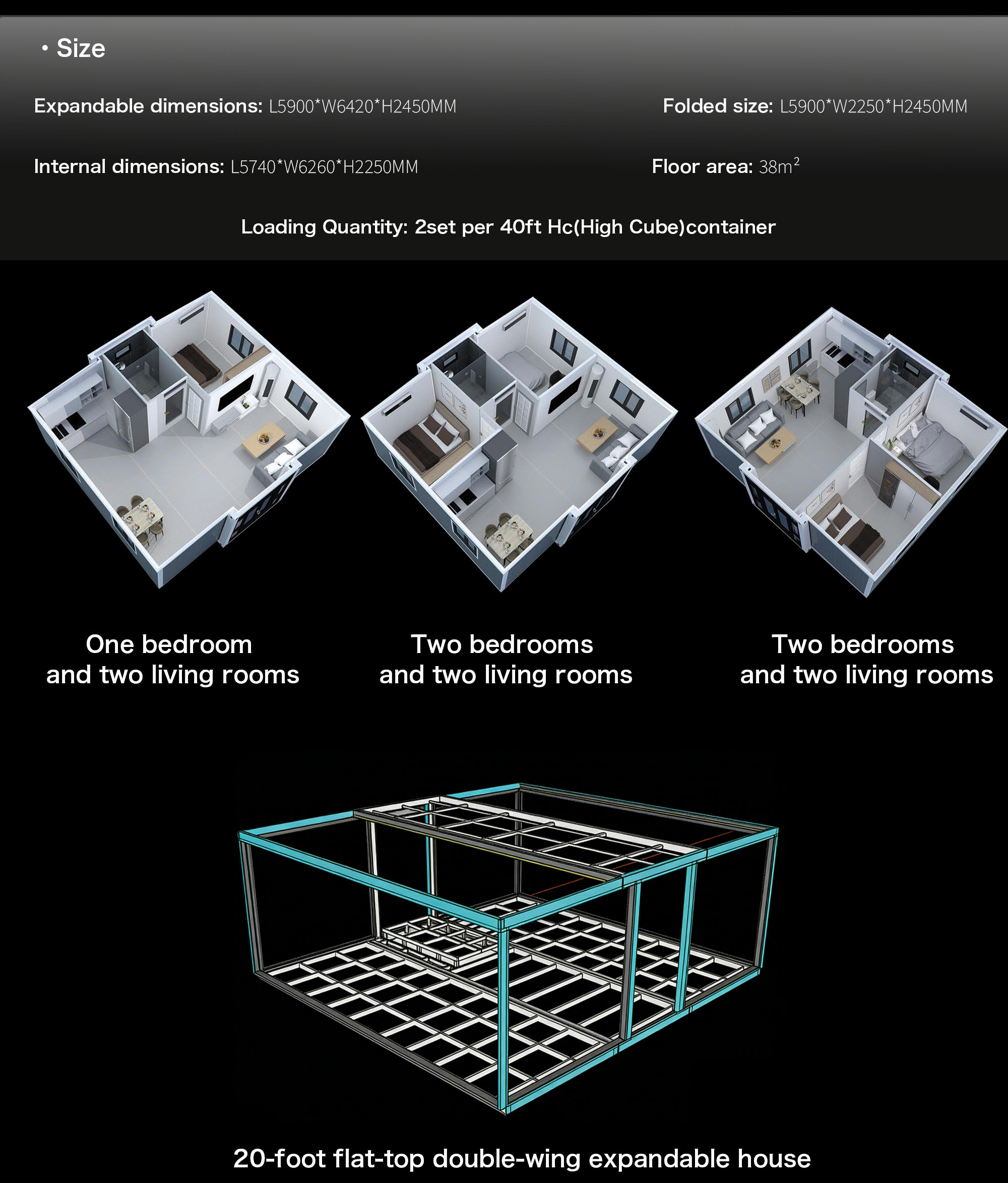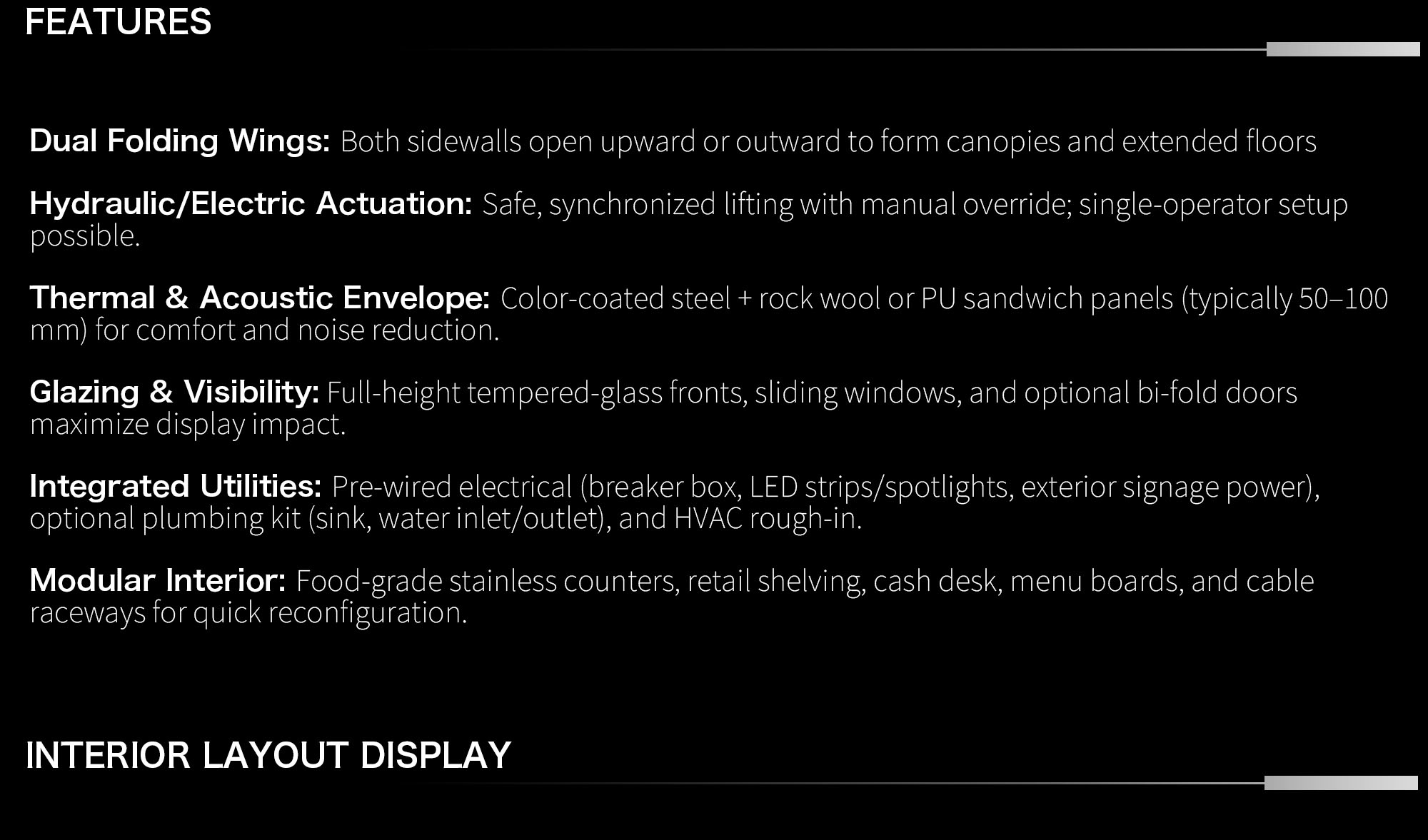 The Double-Wing Expandable Container House is a relocatable, factory-finished building that unfolds from a compact shipping frame into a generous, light-filled interior in a matter of hours. Two side wings hinge out from the core module to create a wide, column-free room that supports living, retail, hospitality, education, healthcare, and office use. Built with a galvanized steel chassis and insulated sandwich panels, it delivers the comfort of a conventional structure while retaining the speed, predictability, and portability of modular construction.